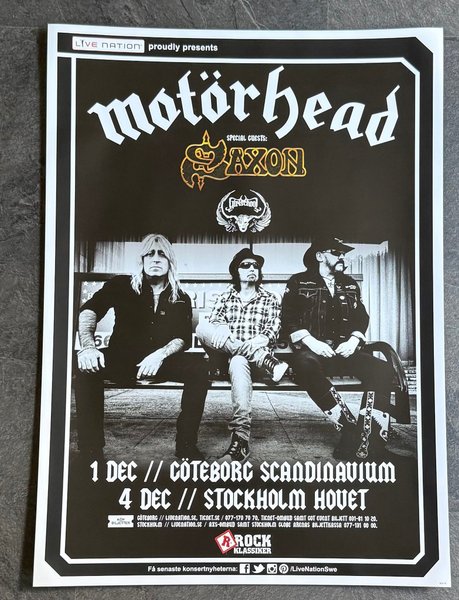 Affisch från Motörheads konsert med Saxon och Girlschool som special guests. Konserten var i Göteborg Scandinavium 1 december och Stockholm Hovet 4 december 2015.