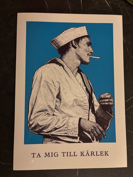 Affisch med motiv av en sjöman som röker en cigarett. Texten "TA MIG TILL KÄRLEK" finns nedtill på affischen.