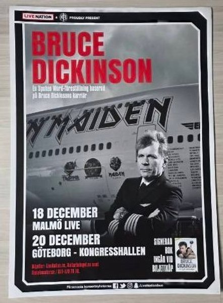Affisch med Bruce Dickinson. Affischen annonserar en "Spoken Word-föreställning baserad på Bruce Dickinsons karriär". Föreställningarna ägde rum den 18 december i Malmö Live och den 20 december i Göteborg - Kongresshallen.