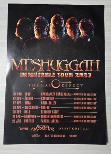 Affisch för Meshuggah Immutable Tour 2023. Affischen listar turnédatum och platser, inklusive Lund, Örebro, Umeå, Stockholm, Oslo, Linköping och Partille. Supportakter Scar Symmetry och Orbit Culture nämns också.
