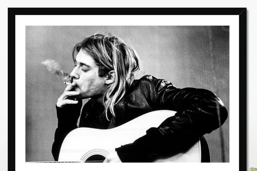 En ikonisk svartvit poster föreställande Kurt Cobain, frontman i det legendariska grungebandet Nirvana. Bilden visar Cobain med gitarr i handen, i ett stilla och rått ögonblick som fångar den autentiska och rebelliska känslan som kom att definiera 90-talets rockmusik.