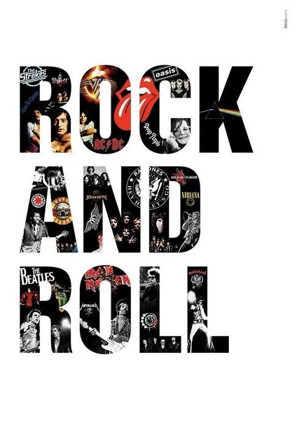 En poster med texten "Rock and Roll" fylld med bilder av kända rockband och artister som The Strokes, Oasis, AC/DC, Deep Purple, The Beatles, Iron Maiden, Metallica, Nirvana m.fl.