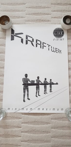 Affisch med motiv från Kraftwerks "Minimum-Maximum" livealbum. Affischen visar bandmedlemmarna som robotliknande figurer vid sina synthesizers. Texten "LIVE 2 CD SET" och "MINIMUM-MAXIMUM" finns också med på affischen. Har själv aldrig använt den. Kommer i pappers rör. Mått 70 x 50 cm.