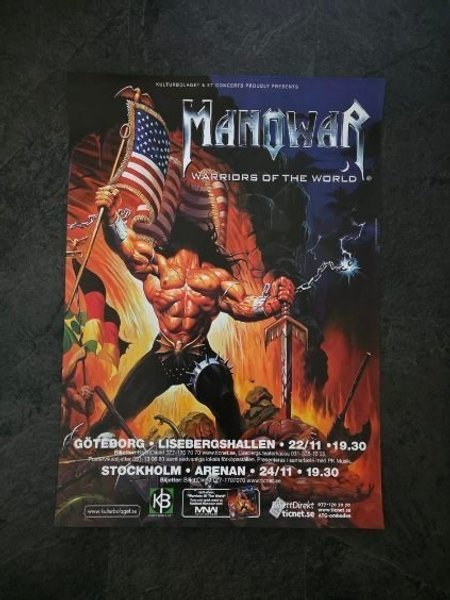 Affisch med motiv av Manowar och texten "Warriors of the World". Affischen annonserar konserter i Göteborg på Lisebergshallen den 22/11 kl 19.30 och i Stockholm på Arenan den 24/11 kl 19.30.