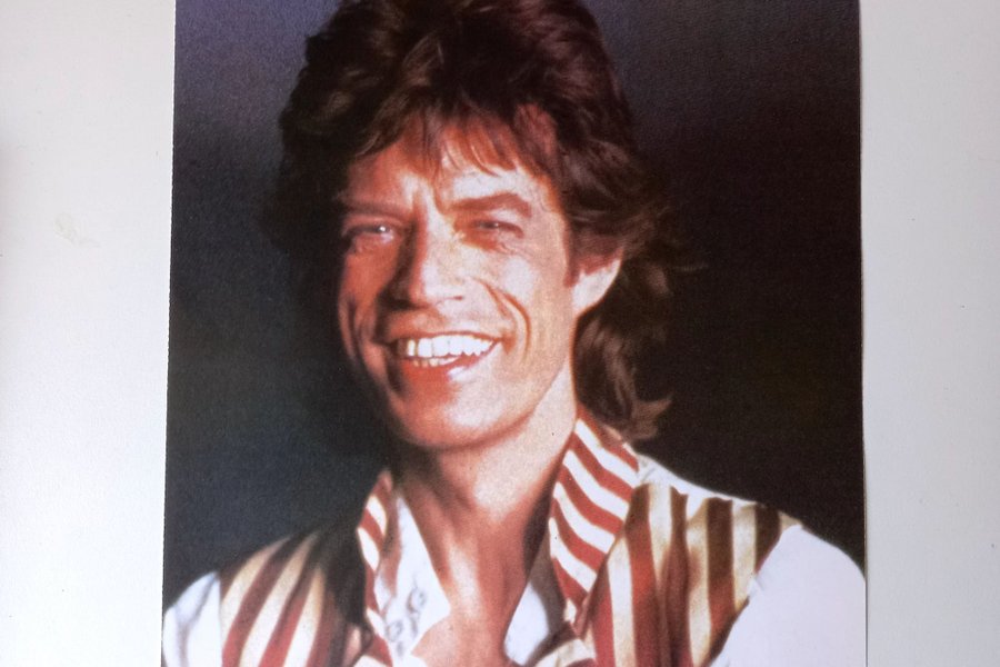 Ett foto av Mick Jagger. Bilden visar Mick Jagger leende, klädd i en vit skjorta och en röd- och vitrandig väst.