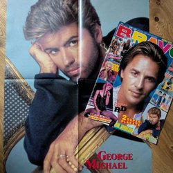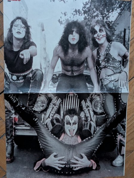 Poster mit Abbildungen der Band KISS. Das Poster zeigt die Bandmitglieder in ihren charakteristischen Kostümen und Make-up. Es ist ein doppelseitiges Poster, das in der Mitte gefaltet ist.