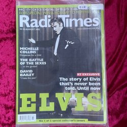 Affisch med Elvis Presley. Bild på Elvis Presley i blå skjorta. Baksidan har en bild på Elvis Presley i blå kavaj. Den stora affischen som är ett porträtt på Elvis motsvarar 8 A4-sidor och fås om man vecklar ut hela tidningen.