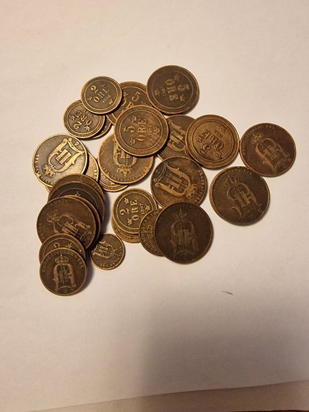 Samling av äldre svenska mynt. Inkluderar 2 Öre från 1883, 1886 och 1897, samt 5 Öre från 1886 och 1887.