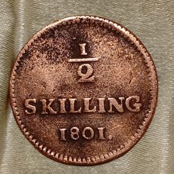 Ett halvt skilling mynt från 1801. Valören är 1/2 skilling.