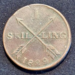 Ett äldre kopparmynt från 1800-talet. Framsidan visar en krona och baksidan har texten "1/4 SKILLING BANCO".