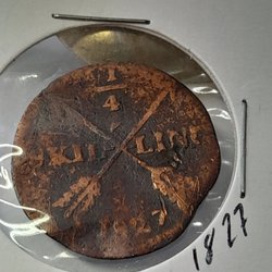 Ett äldre kopparmynt från 1829. Myntet har ett värde av 1/4 skilling.