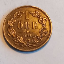 Ett 2 Öre mynt präglat 1872. Myntet har inskriptionen "2 ÖRE" och "1872" på ena sidan, och "LAND SKALL MED LAG BYGGAS" på andra sidan.