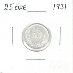 25 ÖRE från 1866. Framsidan visar en bild av Karl XV. Baksidan visar valören 25 ÖRE och årtalet 1866, omgivet av en krans och krönt med en krona.
