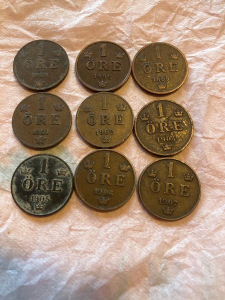 Samling av äldre svenska ören. Inkluderar årtalen 1890, 1896, 1899, 1901, 1902, 1904, 1905, 1906 och 1907. Valören är 1 Öre.