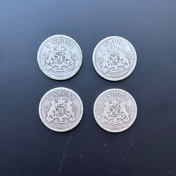 Samling av äldre svenska mynt. Inkluderar ett 10 öre mynt från 1944, samt tre 25 öre mynt från 1896, 1898 och 1907