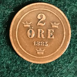 kopparmynt med valören 2 öre. Årtalet är 1883
