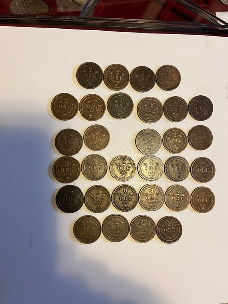 31 2-öringar, 31 olika årtal, 1874-77, 1879-86, 1888-1902, 1904-07