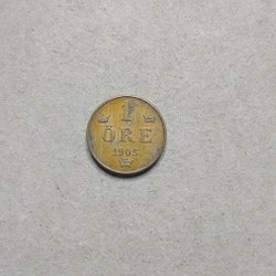 Ett äldre svenskt mynt från 1905 med valören 1 öre. Framsidan visar texten "1 ÖRE" och årtalet "1905", omgivet av tre kronor. Baksidan har en krönt monogram med texten "BRODRAFOLKENS VÄL". Från privat samling. Skick se bilder.
