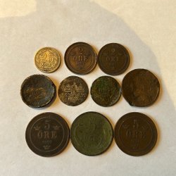 Sex svenska ören. Tre 5 öre från 1890, 1899 och 1907. Tre 2 öre från 1902, 1907 och 1907.