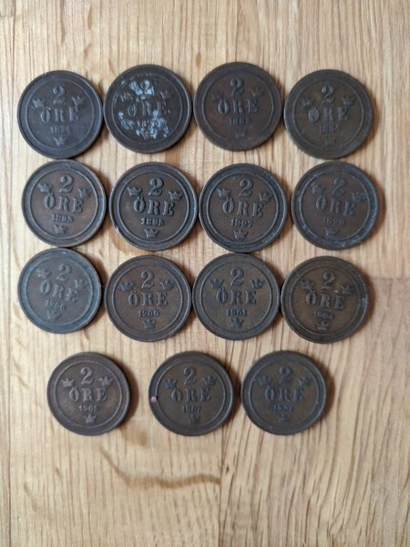 Denna samling innehåller 15 mynt från olika år. Följande år finns representerade: 1874, 1875, 1883, 1884, 1895, 1896, 1897, 1898, 1900 (två stycken), 1901, 1904, 1905, 1907 (två stycken). Alla ören har värdet 2 öre.