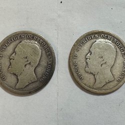 Ett samlarobjekt från 1898 med texten "OSCAR II SVERIGES OCH NORGES KONUNG" på ena sidan och "1 KRONA" samt "BRÖDRAFOLKENS VÄL" på den andra.