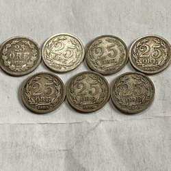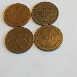 Parti med svenska öre. Innehåller 5 öre från 1905, 1899, 1907 och 1909. Även 2 öre från 1909 och 1777.