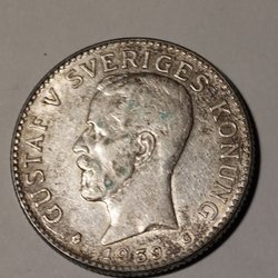 Silvermynt från Sverige med Gustaf V och årtalet 1939. Valören är 2 kr.