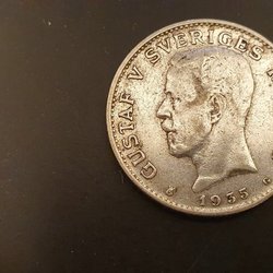 En 1 krona från 1935 med Gustaf V porträtt på ena sidan och Sveriges riksvapen på andra sidan.