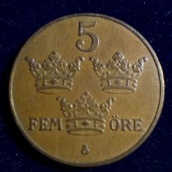 Ett 5 öre mynt med tre kronor motiv. Årtal och värde är tydligt präglade på myntet.