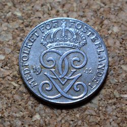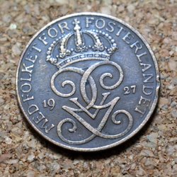 Gustav V mynt från 1927, 2 öre i kvalitet 8.