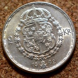 Gustav V silvermynt från 1942, 1 Krona med årtal under bilden i kvalitet 6.