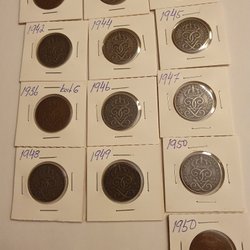 En samling av 5 Öre från Sverige. Årtalen varierar mellan 1942 och 1950.