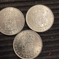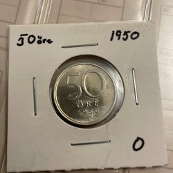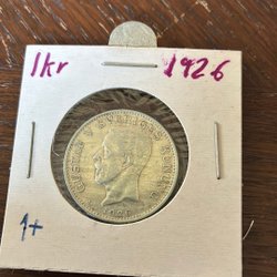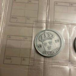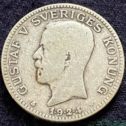 Ett svenskt mynt med Gustaf V Sveriges Konung. År och värde kan utläsas på myntet.