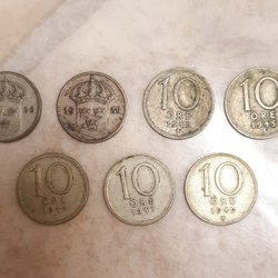 Tre äldre svenska mynt. Inkluderar 10 öre från 1917, 10 öre från 1920 och 10 öre från 1928.