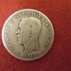 Silvermynt präglat 1910 med Gustaf V:s porträtt och valören 1 krona.