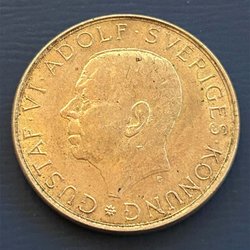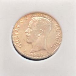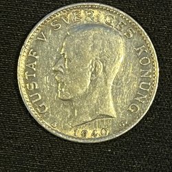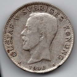 Silvermynt med Gustav V präglat på ena sidan och en krona med texten 'MED FOLKET FÖR FOSTERLANDET' på andra sidan. År: 1940. Värde: 1 kr.