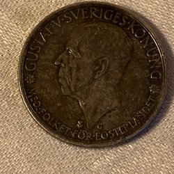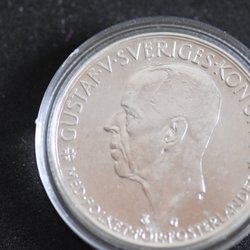 Silvermynt präglat 1935 med Gustav V:s porträtt. Valören är 5 kronor.