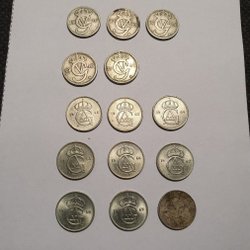 Samling av svenska 10 öre. Inkluderar åren 1902, 1903, 1907, 1909 och 1911.
