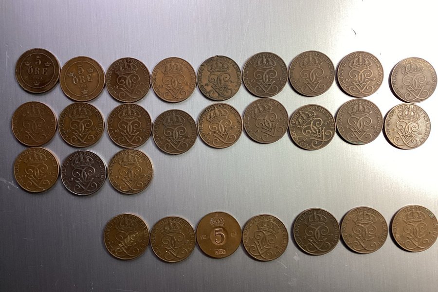 En samling av 5 öre från olika årtal