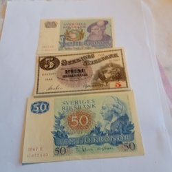 Tre svenska minnesmedaljer. En medalj från 1945-1995 med texten "50 NATIONERNA". En medalj med texten "SVERIGE 5 KRONOR" och en medalj med texten "5 KR".
