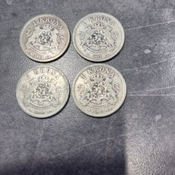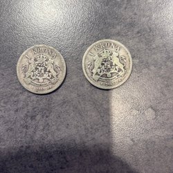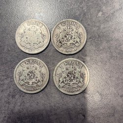 5 öringar från Sverige, präglade år 1916, 1920, 1923, 1926. Framsidan visar valören ”5 FEM ÖRE” och baksidan har texten ”FÖR FOSTERLANDET MED FOLKET.