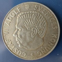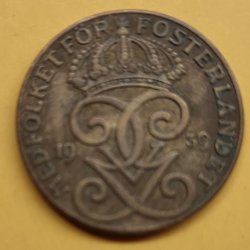 Ett 2 Öre från 1939. 'MED FOLKET FÖR FOSTERLANDET' står skrivet runt kanten.