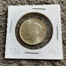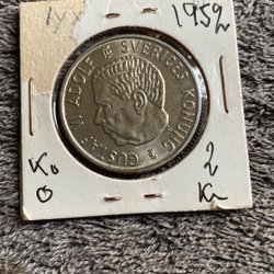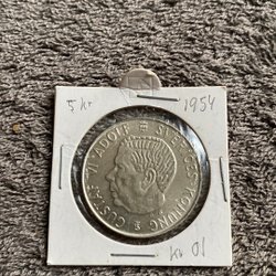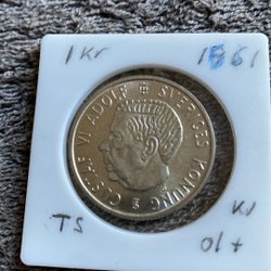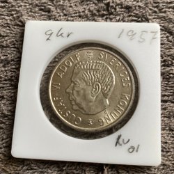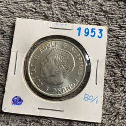 Svensk kunglig medalj från 1950. Framsidan visar Gustaf V Sveriges Konung. Baksidan visar Sveriges riksvapen. Medaljen är i en skyddande hållare.