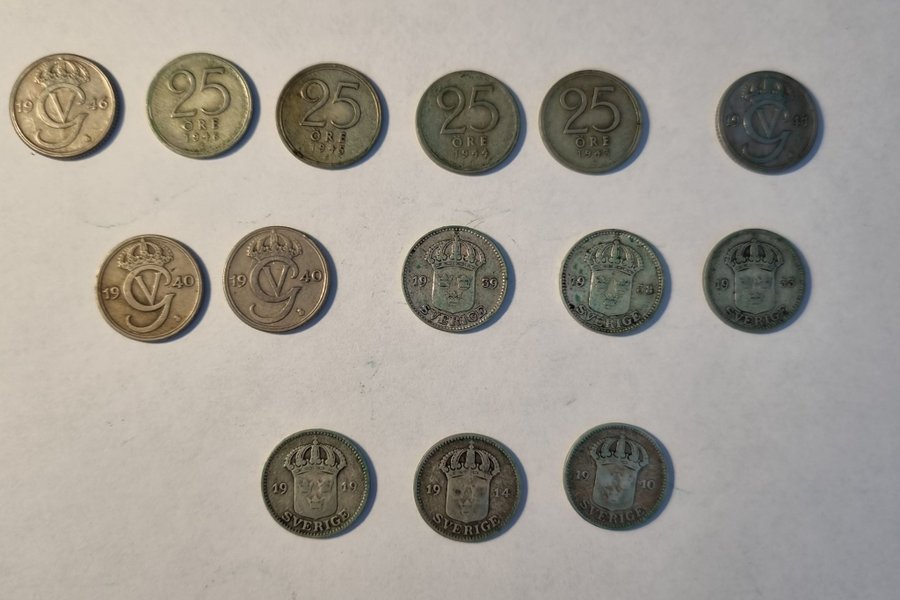 Denna samling innehåller 15 svenska ören. Följande valörer och årtal finns representerade: 25 öre x 2 från 1946, 1945 1944, 1943, 1941, x 2 från 1940, 1939, 1938, 1933, 1919, 1914 och 1910. Dessutom 1 från 1904, ej på bild.