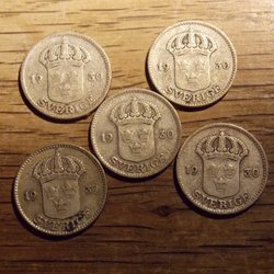 Ett äldre mynt från Sverige, präglat år 1930 med ett värde av 25 öre.