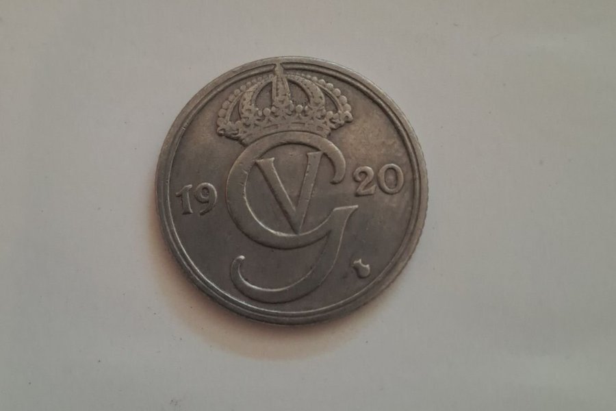 Detta är ett äldre svenskt mynt från 1920. Myntet har ett värde av 20 öre.