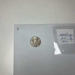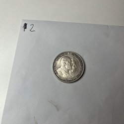 Jubileumsmedalj från 1921 med en valör av 2 kronor. Framsidan visar ett porträtt av Gustav V. Baksidan har texten "TREHUNDRA ÅR AF SVENSK MYNTNING GUSTAF II ADOLF 1621-1921".
