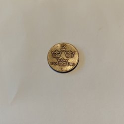Ett 2 Öre från 1939. 'MED FOLKET FÖR FOSTERLANDET' står skrivet runt kanten.