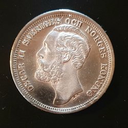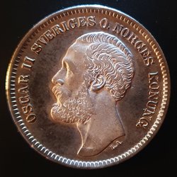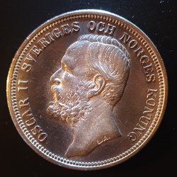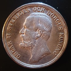 Ett samlarobjekt från 1910 med Konung Gustav V. Framsidan visar Konung Gustav V och årtalet 1910. Baksidan visar Sveriges riksvapen och texten "MED FOLKET FÖR FOSTERLANDET 2 KR".