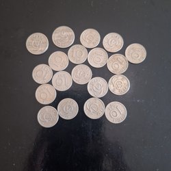Tre ören från Sverige. Två 5 ören från 1907 och 1908, samt ett 1 öre från 1908.